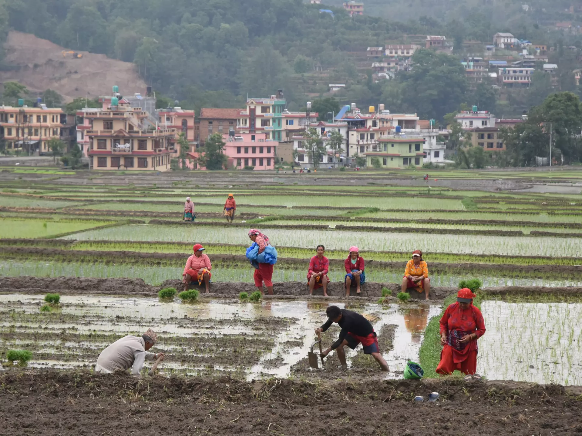 And the colors were gorgeous. On all sides, lush green hills were backed by an Impressionist wash of mottled, gray-blue clouds, and pools of water-made mirrors of the cascading rice terraces, reflecting women in crimson kurta suruwal pajamas planting rice for the coming monsoon season. I finished the ride in the courtyard of Panauti’s towering, three-tiered Indreshwar Mahadev temple feeling thoroughly elated.