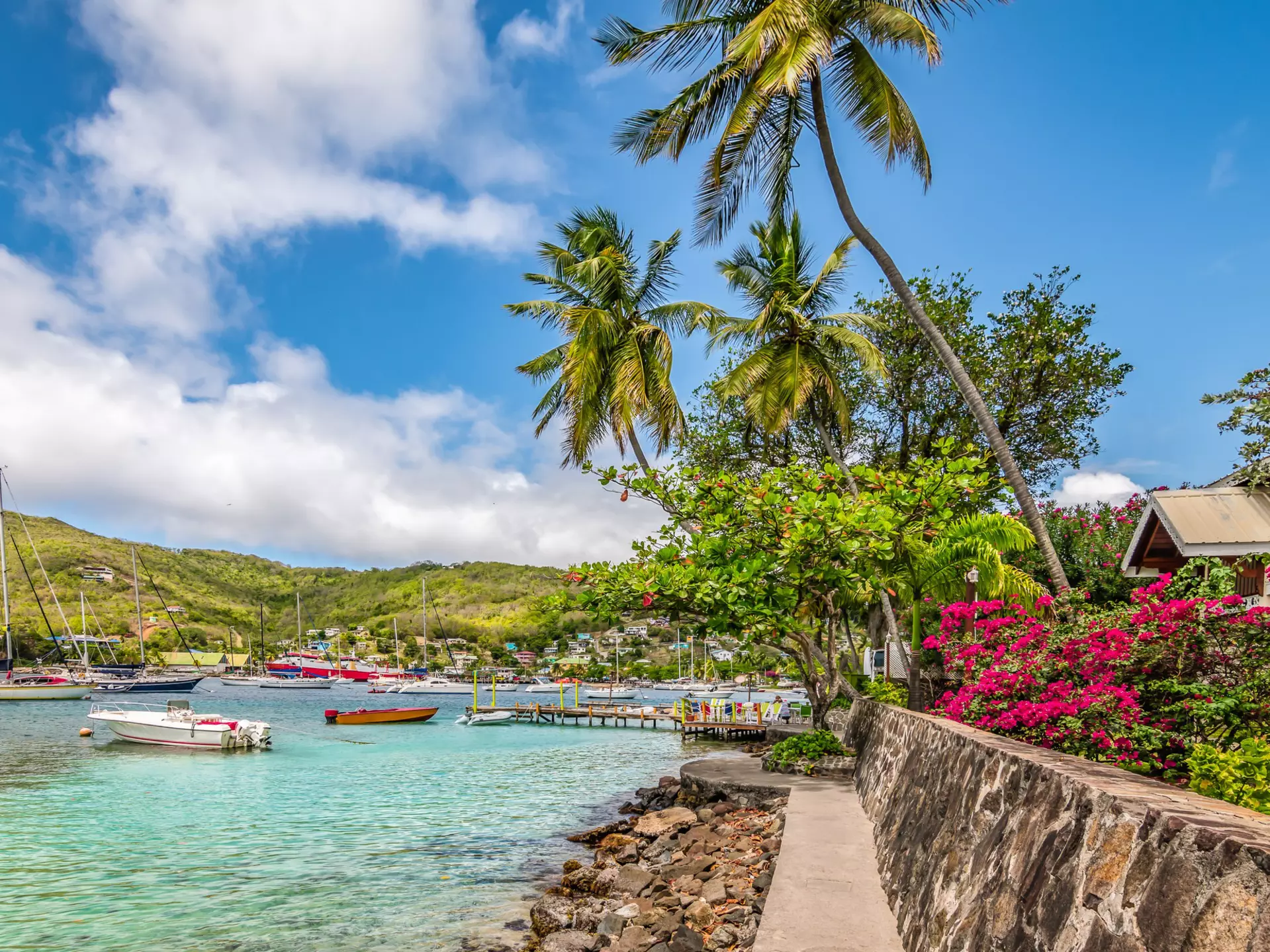 The harbor in Bequia lined with palm trees. Nancy Pauwels/Shutterstock
