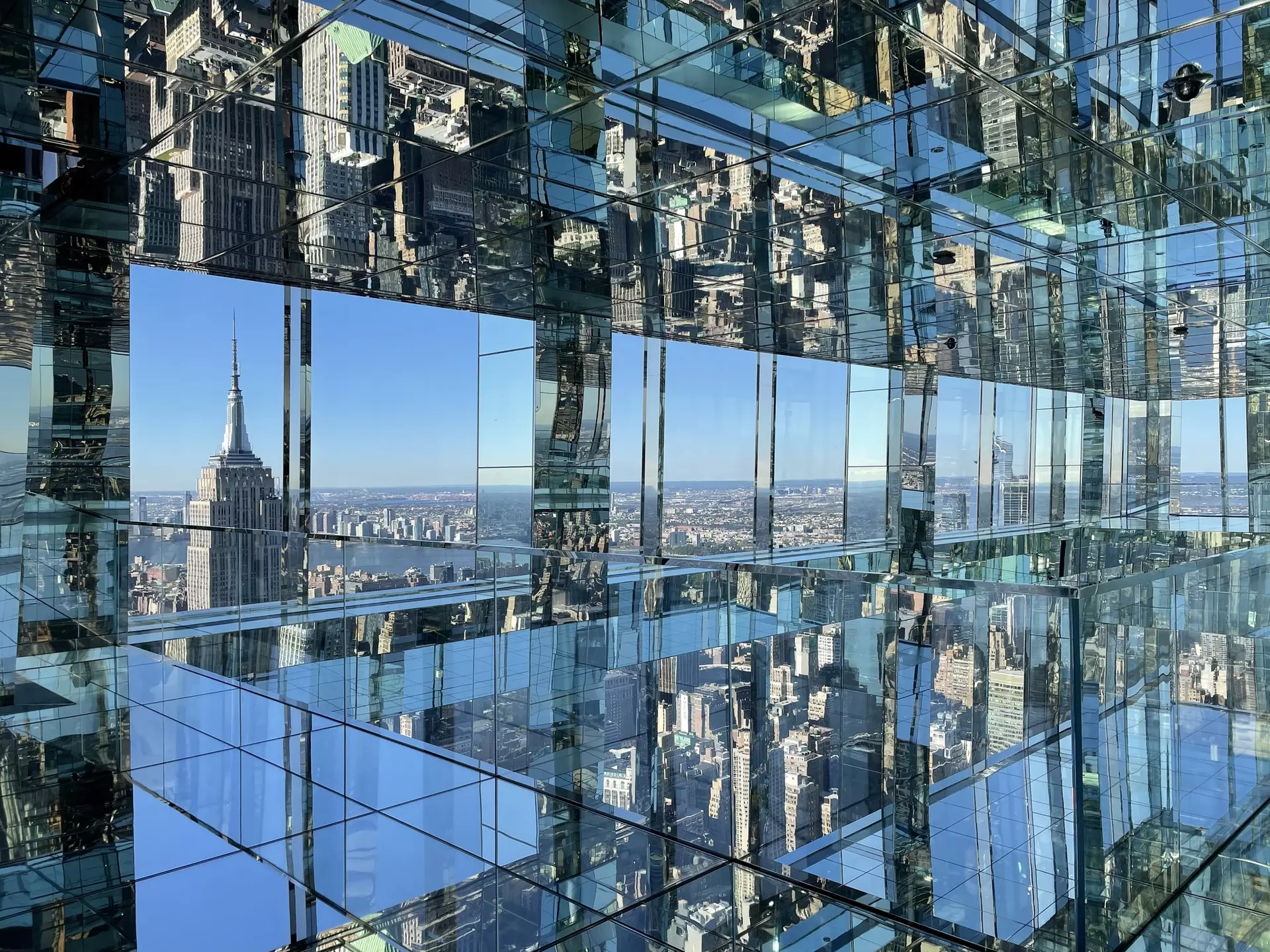 Constructed over two stories, the observatory looks and feels like you’re standing in a massive mirrored box. (The space can get so bright that we were handed sunglasses on the way in, and visitors are encouraged to bring their own.) A stroll around it reveals Google Maps-worthy views over the shining Chrysler Building, Central Park, the Hudson River and Bryant Park. But it will also show you infinite reflections of yourself and your fellow visitors and create the sensation that you're floating along the reflective floor.